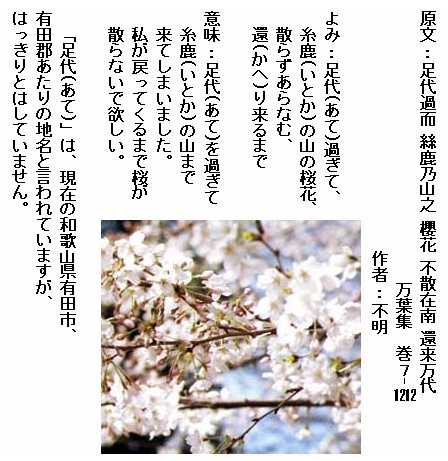巻7-1212: 足代過ぎて糸鹿の山の桜花散らずもあらなむ帰り来るまで