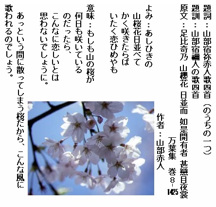 巻8-1425: あしひきの山桜花日並べてかく咲きたらばいたく恋ひめやも