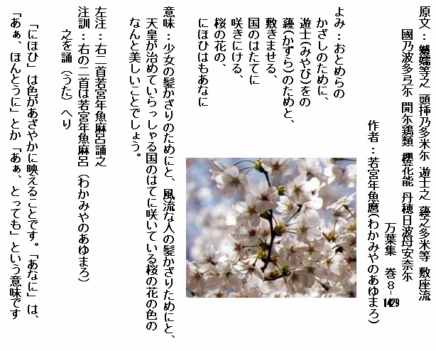 万葉集は梅ばかり詠んでいるのかというと、そうでもなくて桜を詠んだ歌もかなりあるんですね。万葉集の時代にも桜は人々に愛されていたようです。