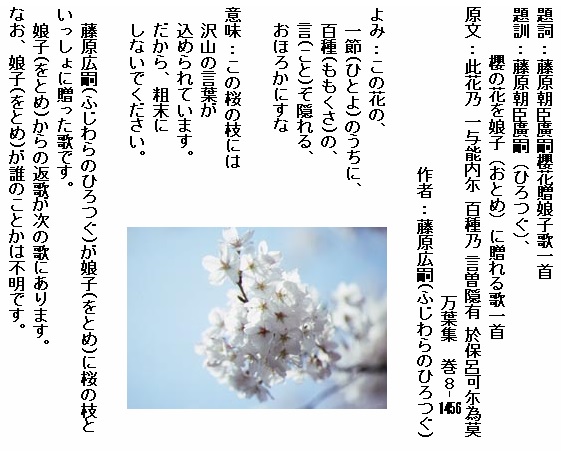 巻8-1456: この花の一節のうちに百種の言ぞ隠れるおほろかにすな