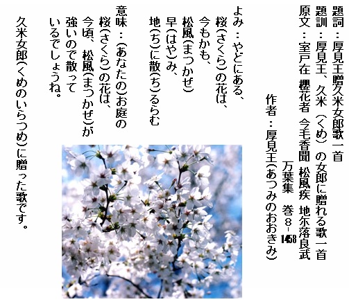 巻8-1458: やどにある桜の花は今もかも松風早み地に散るらむ