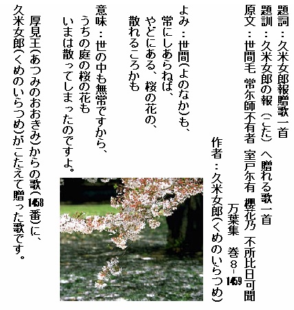 巻8-1459: 世間も常にしあらねばやどにある桜の花の散れるころかも