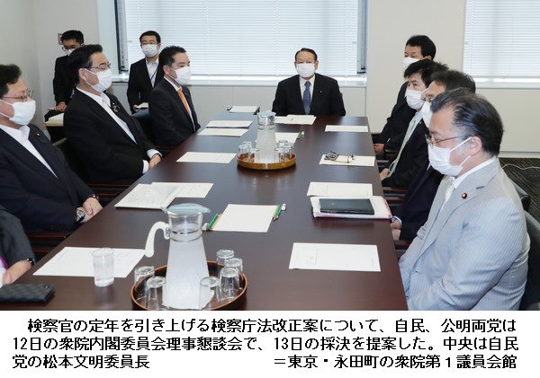 自公、検察定年延長14日にも採決=野党は修正案、徹底抗戦へ ―― 検察官の定年を引き上げる検察庁法改正案について、自民、公明両党は12日の衆院内閣委員会理事懇談会で、13日の採決を提案した。立憲民主党など野党共同会派が拒否したため見送る方向だが、14日にも採決に踏み切り、週内に衆院を通過させる方針。野党は徹底抗戦の構えで、検察幹部の留任を特例的に可能とする条項を削除する修正案を提示した。