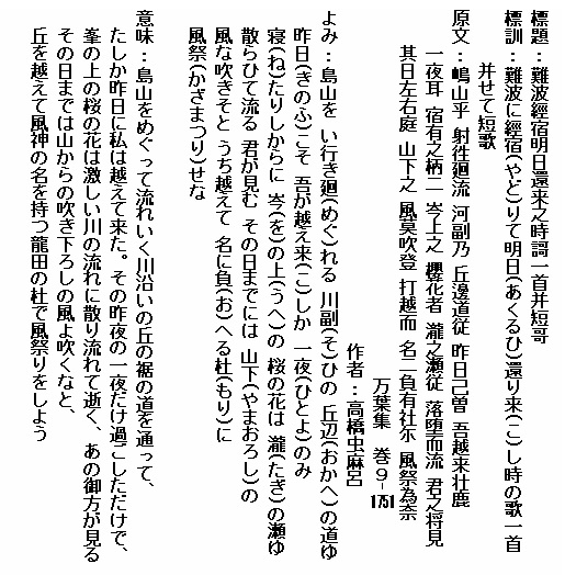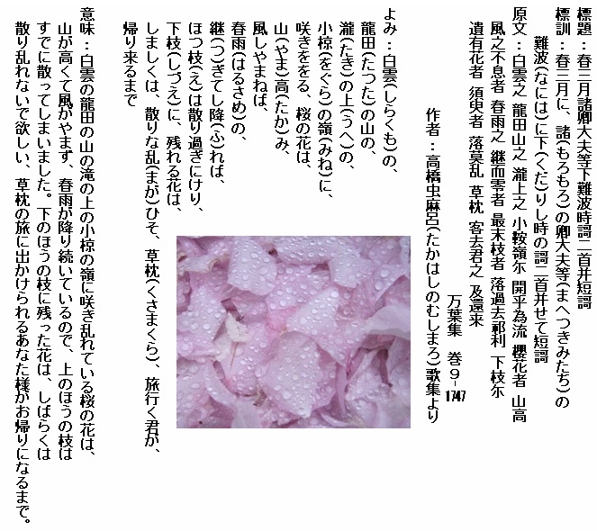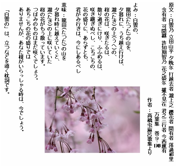 巻9-1747: 白雲の龍田の山の瀧の上の小椋の嶺に咲きををる.......(長歌)