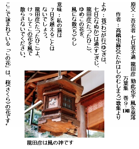巻9-1748: 我が行きは七日は過ぎじ龍田彦ゆめこの花を風にな散らし