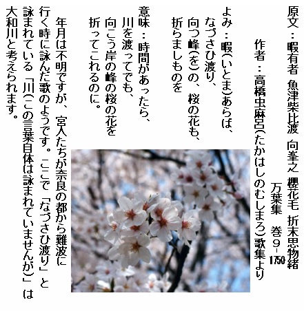 巻9-1750: 暇あらばなづさひ渡り向つ峰の桜の花も折らましものを