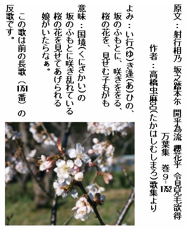 巻9-1752: い行き逢ひの坂のふもとに咲きををる桜の花を見せむ子もがも
