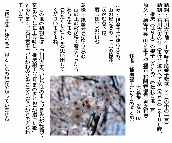 巻9-1776: 絶等寸の山の峰の上の桜花咲かむ春へは君し偲はむ