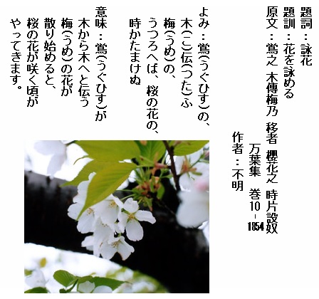 巻10-1854: 鴬の木伝ふ梅のうつろへば桜の花の時かたまけぬ