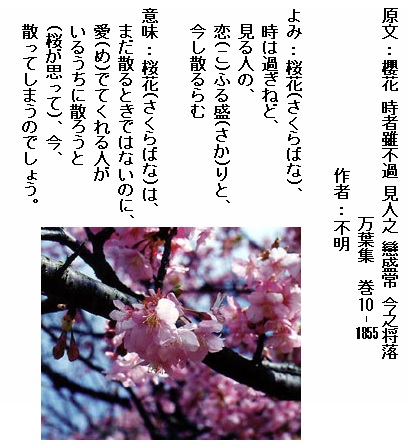 巻10-1855: 桜花時は過ぎねど見る人の恋ふる盛りと今し散るらむ