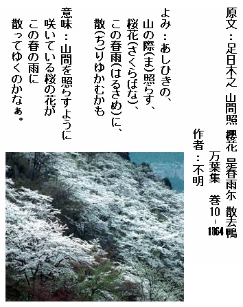 巻10-1864: あしひきの山の際照らす桜花この春雨に散りゆかむかも