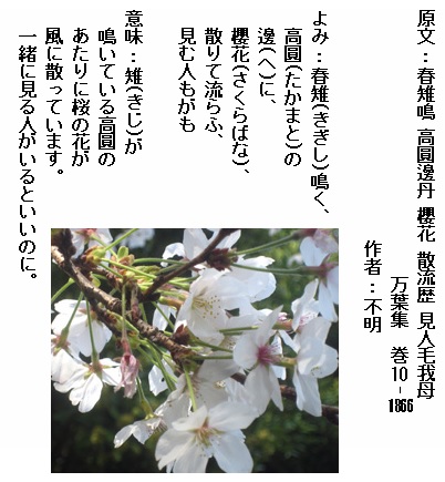 巻10-1866: 雉鳴く高円の辺に桜花散りて流らふ見む人もがも