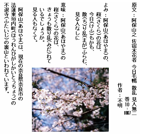 巻10-1867: 阿保山の桜の花は今日もかも散り乱ふらむ見る人なしに