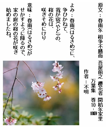 巻10-1869: 春雨に争ひかねて我が宿の桜の花は咲きそめにけり