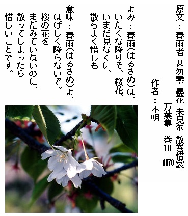 巻10-1870: 春雨はいたくな降りそ桜花いまだ見なくに散らまく惜しも