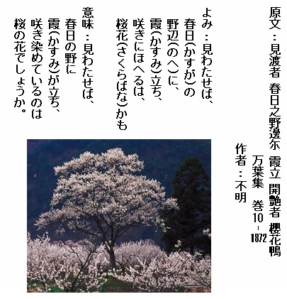 巻10-1872: 見わたせば春日の野辺に霞立ち咲きにほへるは桜花かも
