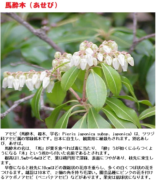 アセビに「馬酔木」の字を当てているのは、一説に中国からの渡来人に伴われて来た馬が食べて酔っ払ったようになったためといわれます。アセビの語源ははっきりしないが「足しびれ」から来たともいわれます。万葉集にも多く詠まれた万葉植物です。