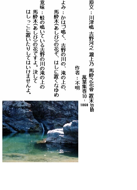 巻10-1868: かはづ鳴く 吉野の川の 滝の上の
