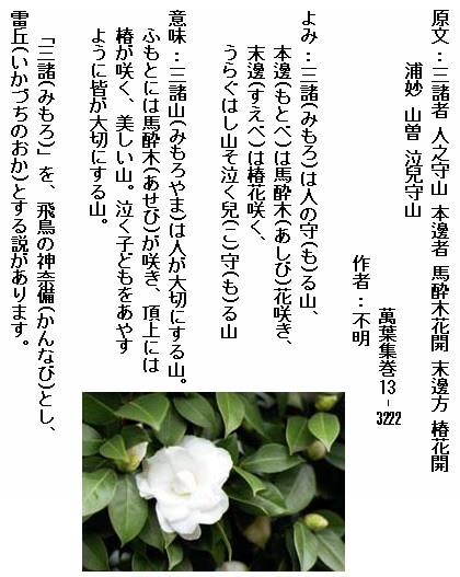 巻13-3222: 三諸は 人の守る山 本辺は馬酔木咲く