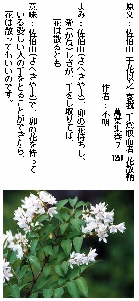 巻7-1259: 佐伯山卯の花持ちし愛しきが手をし取りてば花は散るとも