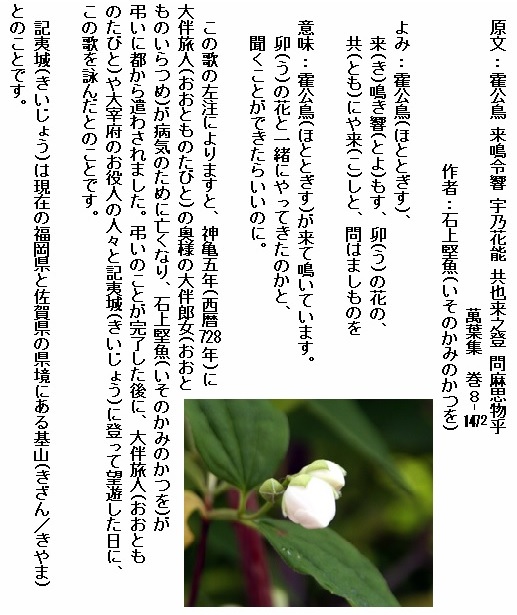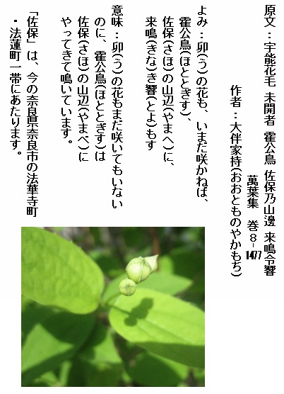 巻8-1477: 卯の花もいまだ咲かねば霍公鳥佐保の山辺に来鳴き響もす