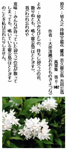 巻8-1482: 皆人の待ちし卯の花散りぬとも鳴く霍公鳥我れ忘れめや