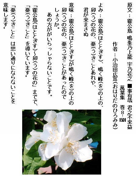 巻8-1501: 霍公鳥鳴く峰の上の卯の花の憂きことあれや君が来まさぬ