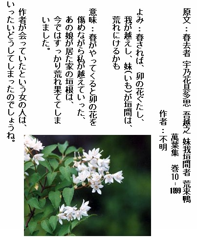 巻10-1899: 春されば卯の花ぐたし我が越えし妹が垣間は荒れにけるかも