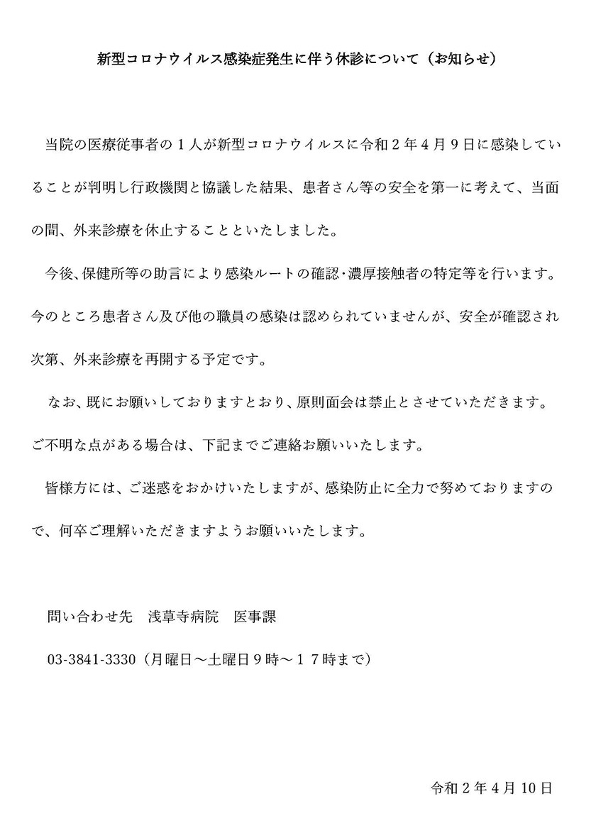 4月9日(午後2時頃)に浅草寺病院で、定期検診を受けました。その時の担当医師の話によると、「今のところ、院内でコロナウイルスの感染はありません」ということでしたが、女房の話によると、昨日(4月13日)の朝のテレビで浅草寺病院内で職員のウイルス感染者が出たというテロップが出たということでした。パソコンで調べてみると、浅草寺病院からの「お知らせ」が出ていました。