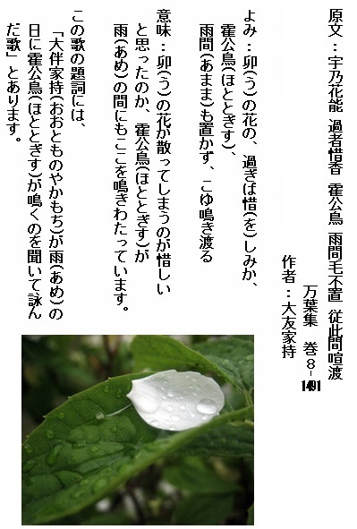 巻8-1491: 卯の花の過ぎば惜しみか霍公鳥雨間も置かずこゆ鳴き渡る