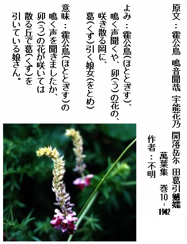 巻10-1942: 霍公鳥鳴く声聞くや卯の花の咲き散る岡に葛引く娘女