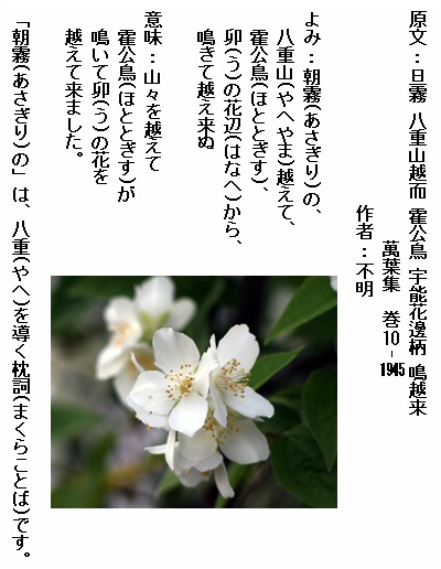 巻10-1945: 朝霧の八重山越えて霍公鳥卯の花辺から鳴きて越え来ぬ