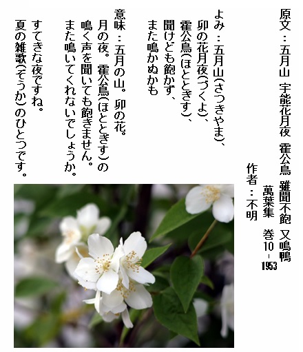 巻10-1953: 五月山卯の花月夜霍公鳥聞けども飽かずまた鳴かぬかも