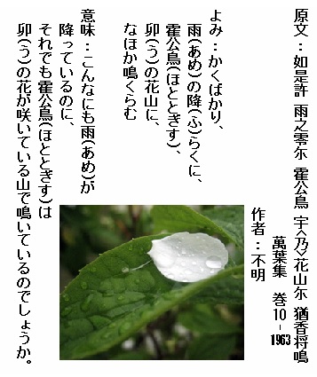 巻10-1963: かくばかり雨の降らくに霍公鳥卯の花山になほか鳴くらむ
