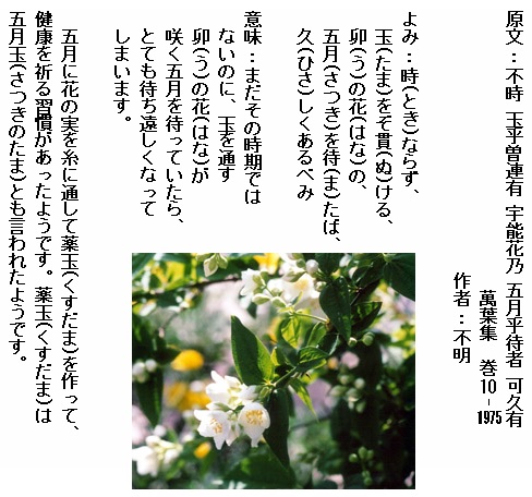 巻10-1975: 時ならず玉をぞ貫ける卯の花の五月を待たば久しくあるべみ