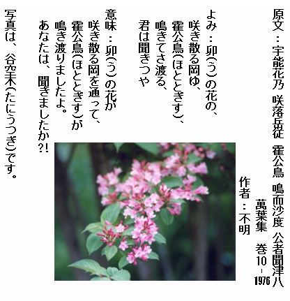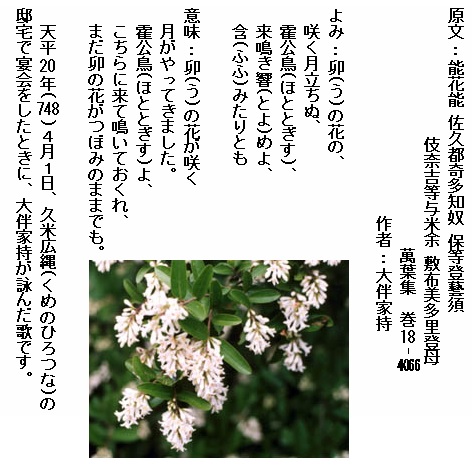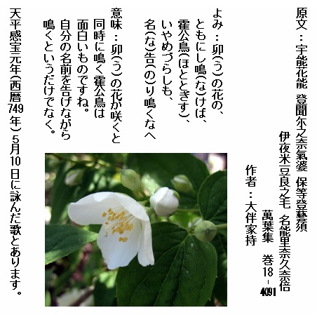 巻18-4066: 卯の花の咲く月立ちぬ霍公鳥来鳴き響めよ含みたりとも