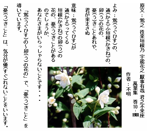 巻10-1988: 鴬の通ふ垣根の卯の花の憂きことあれや君が来まさぬ