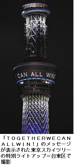 特別ライティングでは、地球をイメージした濃い青色が先端や中腹を彩る。地上350メートルの天望デッキには「TOGETHER WE CAN ALL WIN!(みんなで打ち勝とう)」のメッセージを投影している。