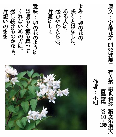 巻10-1989: 卯の花の咲くとはなしにある人に恋ひやわたらむ片思にして