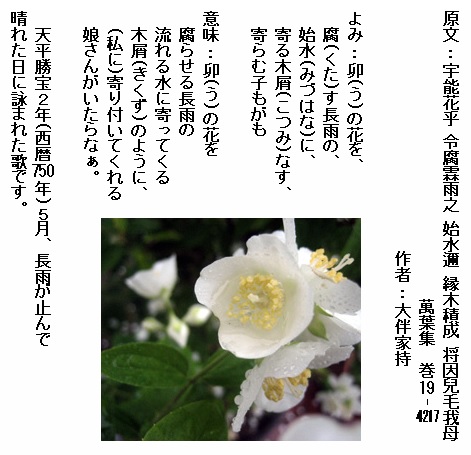 巻19-4217: 卯の花を腐す長雨の始水に寄る木屑なす寄らむ子もがも
