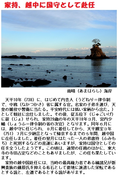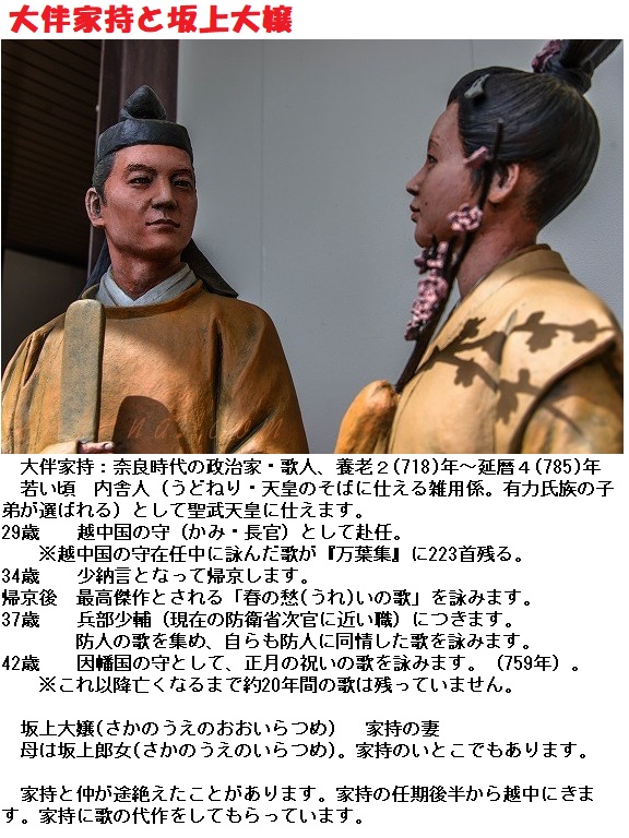 大伴家持が越中国(=富山県から能登半島を含む北国一帯の地域)に、国司(くにのつかさ)として赴任していたときに詠まれたものです。時期は、家持が越中に赴任した翌年の天平19年(西暦747年)3月20日。このとき家持は30歳。この歌は、奈良の都に残してきた最愛の妻、坂上大嬢(さかのうえのおおいらつめ)へ贈られました。