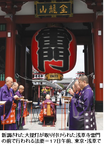 明るい浅草再び 雷門大提灯 新調 ―― 東京・浅草寺の雷門に十七日午前、新しい大提灯(ちょうちん)がつるされた。専門の職人が早朝から作業を始め、約一カ月ぶりに真っ赤な「浅草の顔」が街に戻った。