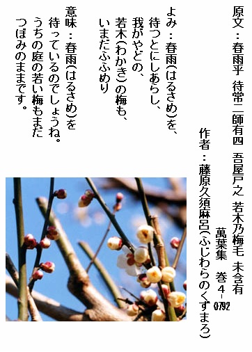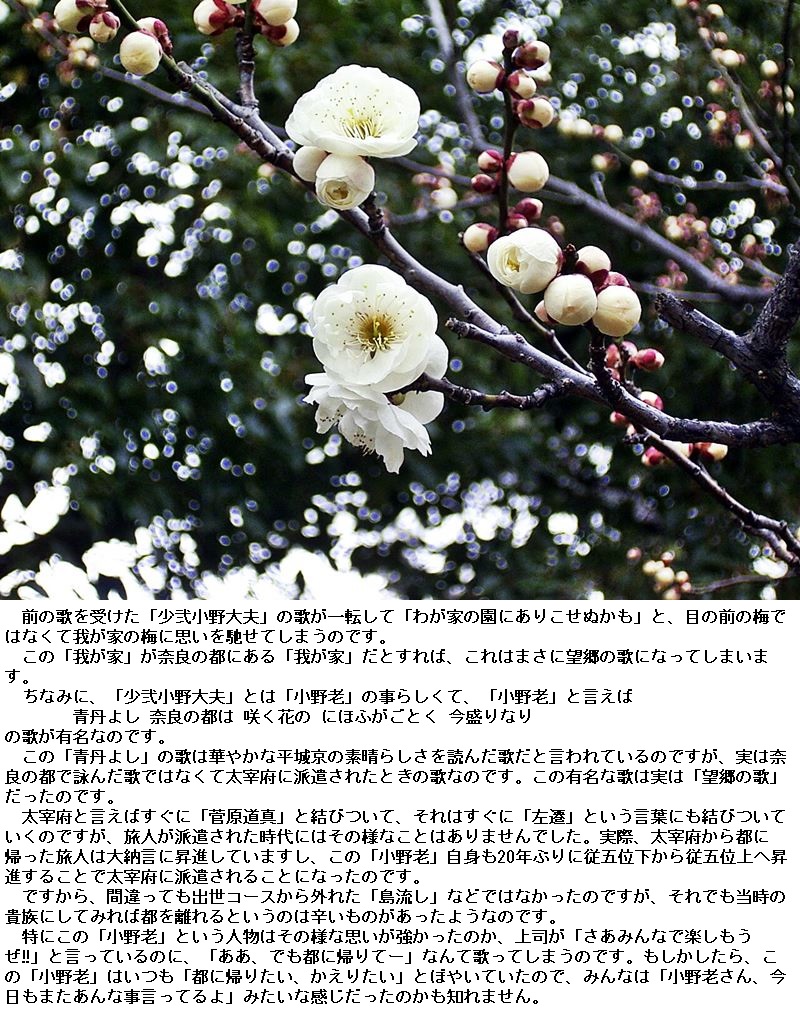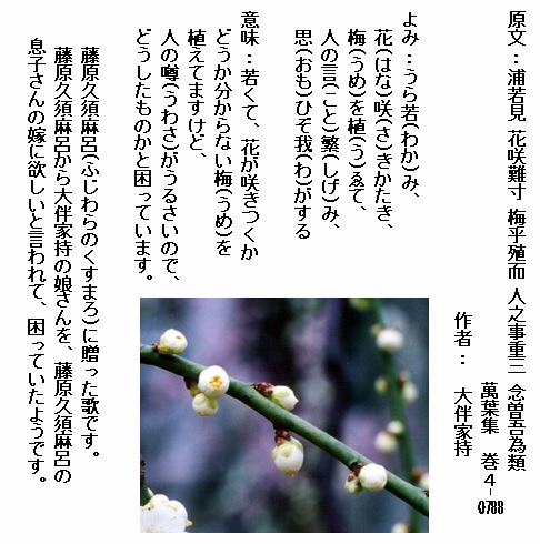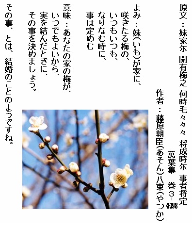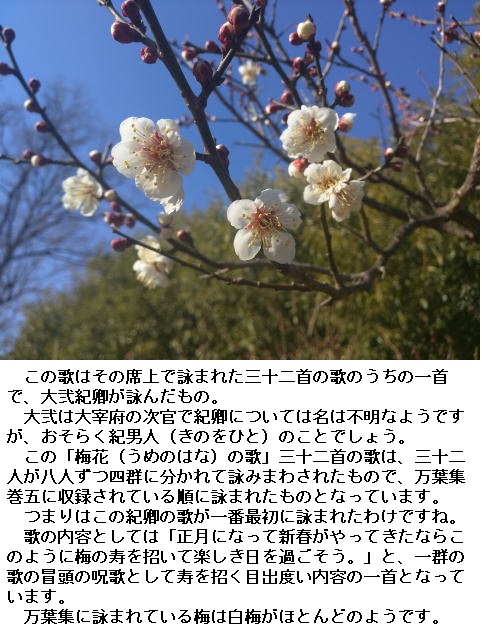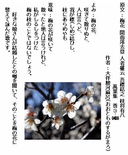 意味 梅の花は今が盛りです。親しい友よ梅の花枝を飾って眺めましょう。花は今が盛りです。