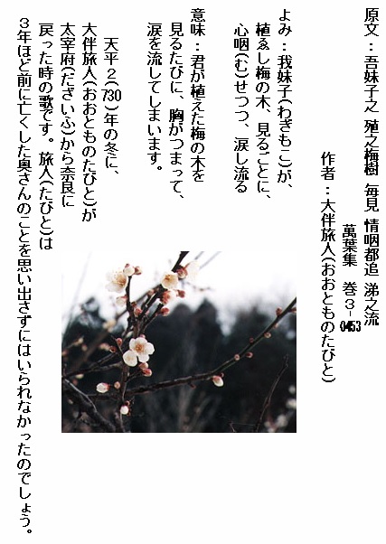 意味 梅の花は今咲いているように散り去ることなく吾が家の庭に咲き続けてほしいよ。