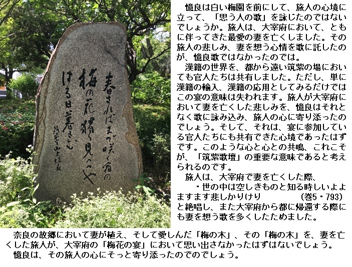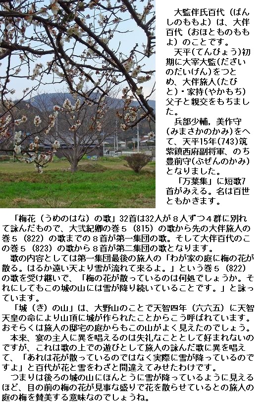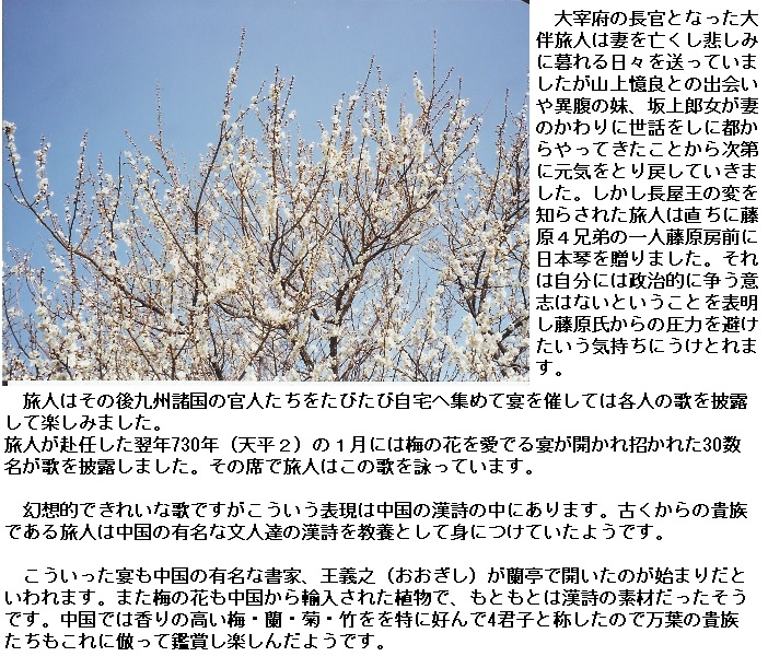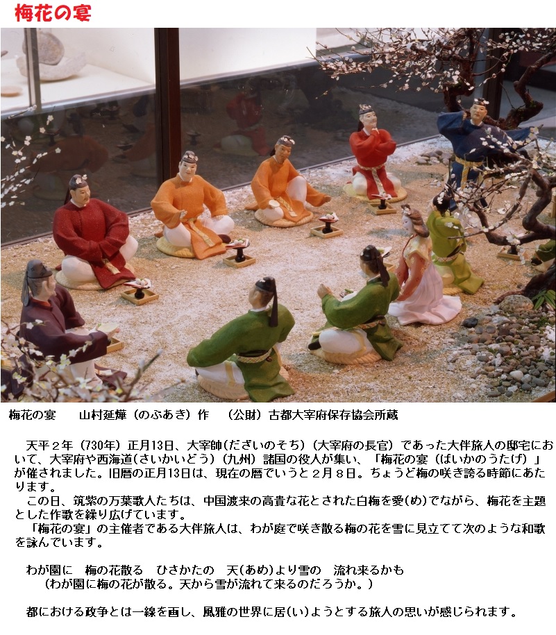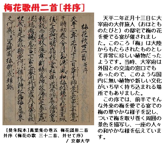 天平二年正月十三日、萃于帥老之宅、申宴會也。于時、初春令月、氣淑風和、梅披鏡前之粉、蘭薫珮後之香。加以、曙嶺移雲、松掛羅而傾盖、夕岫結霧、鳥封穀而迷林。庭舞新蝶、空歸故鴈。於是盖天坐地、促膝飛觴。忘言一室之裏、開衿煙霞之外。淡然自放、快然自足。若非翰苑、何以濾情。詩紀落梅之篇。古今夫何異矣。宜賦園梅聊成短詠。