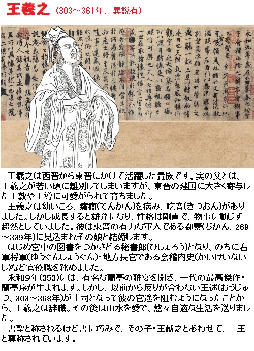 この序には書の世界の神的存在である古代中国の書家、王義之(おうぎし)の最も高名な作品『蘭亭の序』から引用したスタイルが多くみられるとのことですが、『蘭亭の序』は蘭亭という場所を会場にしてもよおされた宴の席で参加者が詠んだ27編の詩の序として、イイ心持ちに酔った主催者の王義之が書いたものだそうです。なるほど状況設定が旅人と同じです。