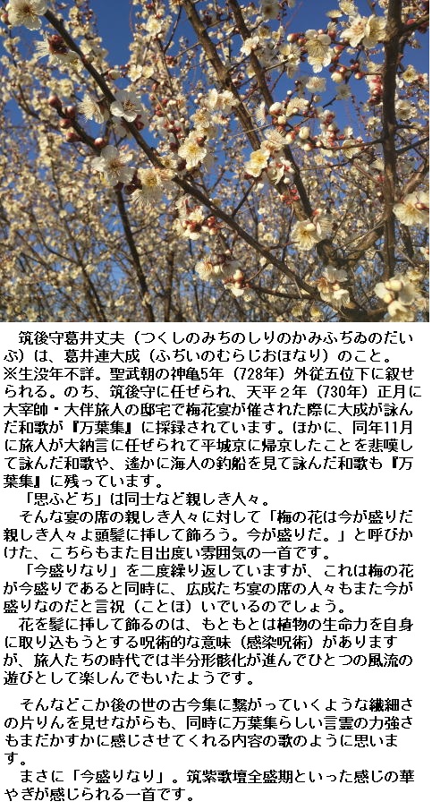 訓読 梅の花今盛りなり思ふどちかざしにしてな今盛りなり