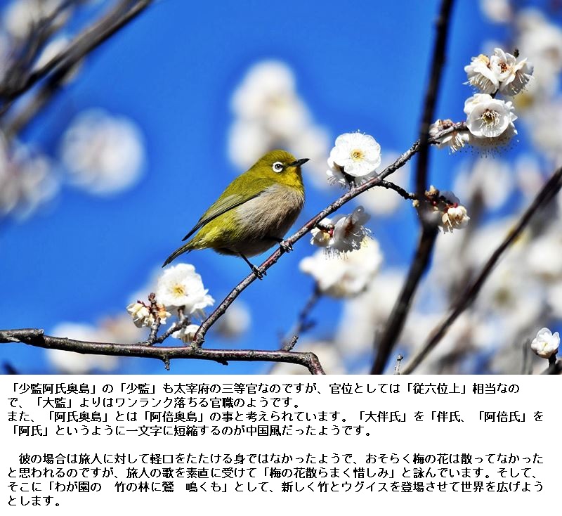 訓読 梅の花散らまく惜しみ吾(わ)が苑(その)の竹(たけ)の林に鴬鳴くも