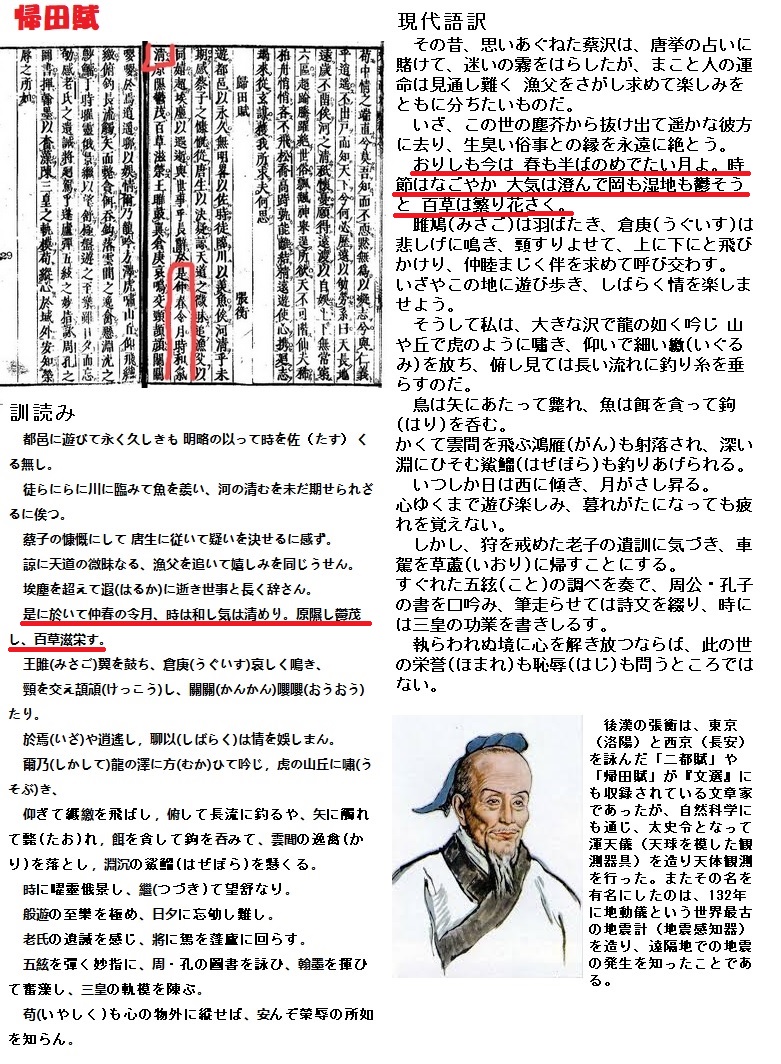 これは、「文選」(530年頃成立)巻十五にある後漢の張衡(ちょうこう)が詠んだ「帰田賦」の、「於是仲春令月 時和氣清」(これにおいて、仲春の令月、時は和し気は清む)を踏まえているのです。