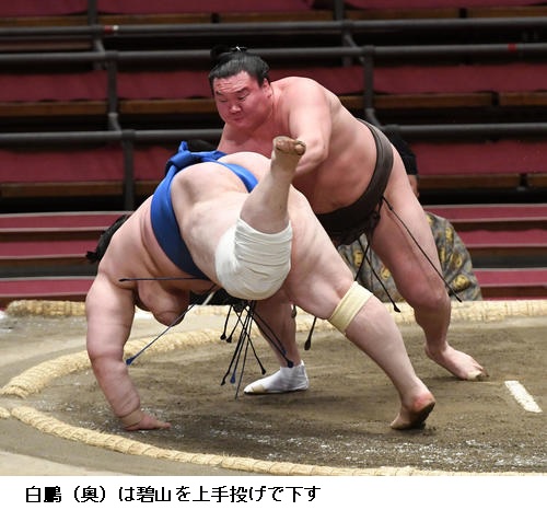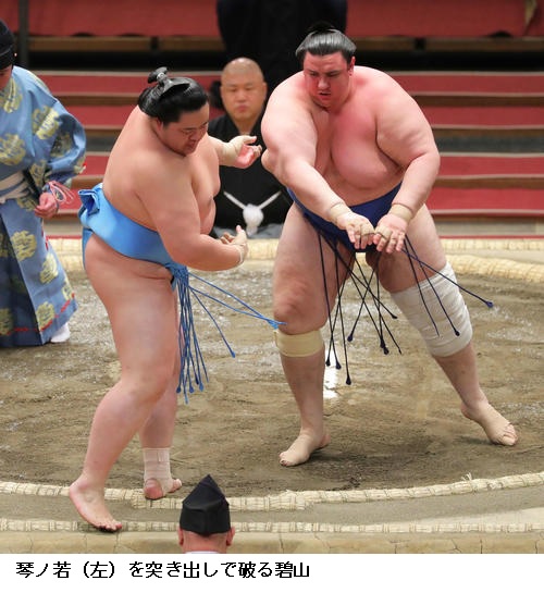1敗を守った碧山は「落ち着いて取れた。もろ手で当たってからいなされたが体が反応してすぐに動いて攻めることができた。10勝はうれしい。1日、1日、自分の相撲を目指して、残りの取組の数を意識せず相撲を取っていきたい。あすもまた稽古があるのできょうはゆっくりしたい」と丁寧な話しぶりでした。